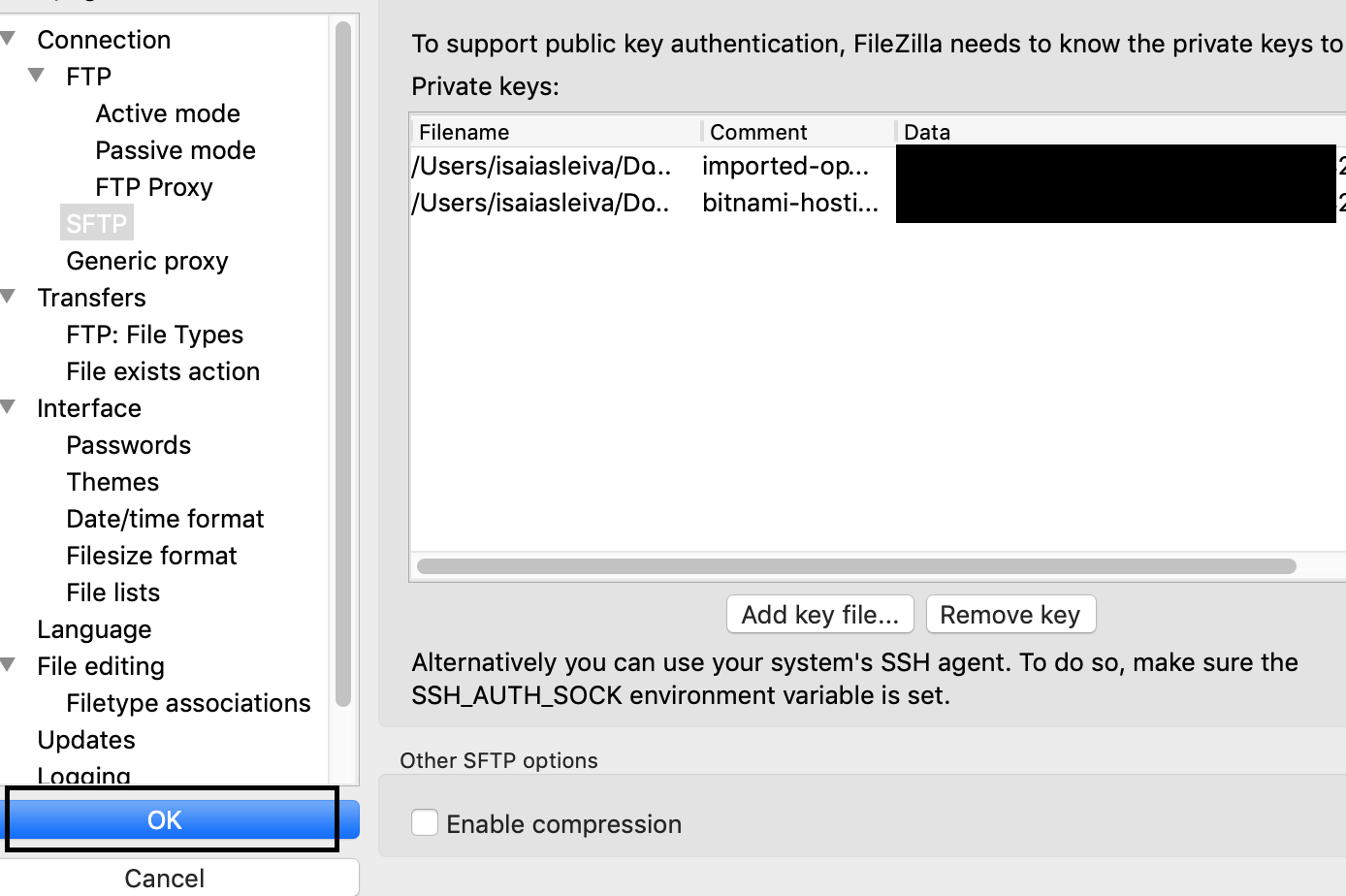 Adding an encryption key to Filezilla from Bitnami ( Mac OS)